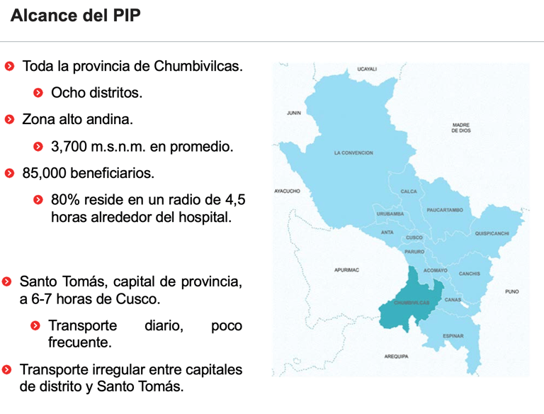 Con la ejecución del primer PIP para implementar una red integrada de salud, la provincia de Chumbivilcas mejoró su capacidad para coordinar y complementar los servicios de salud disponibles tanto en el Hospital Santo Tomás como en el primer nivel porque se cumplieron cinco objetivos:
