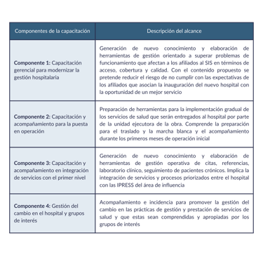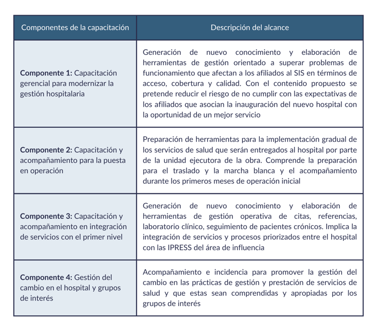 Durante 14 meses se capacitará al personal asistencial y administrativo del actual hospital para que logre ocho hitos durante tres fases: (i) Fase de planificación; (ii) fase de traslado y marcha blanca y, (iii) fase de operación inicial.