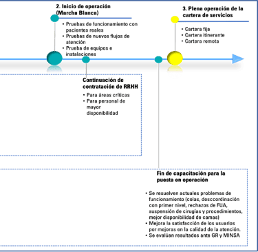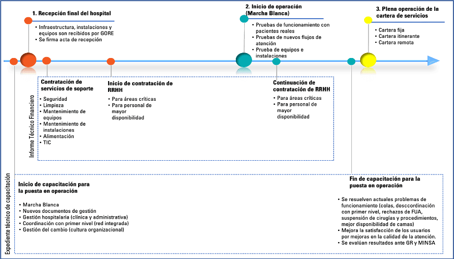 Durante la fase previa a la puesta en operación, se desarrollaron una serie de instrumentos de gestión como el Manual de Procesos y Procedimientos, Manual de Operaciones, el Plan Funcional, 10 guías de práctica clínica, el Plan de Traslado y Marcha Blanca, el Presupuesto de Implementación Multianual 2022-2024, planes de mejora de la calidad, modelo de citas en el primer nivel hacia el hospital. Estos son desarrollados bajo el modelo de capacitación in situ y en servicio y se realiza con el recurso humano que asume la responsabilidad directa de la operación y mantenimiento en la fase de post inversión.